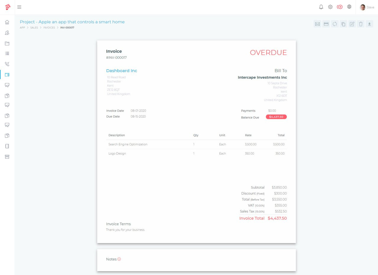 We have created a very easy-to-use invoicing system. There is now no need for you to use a third party invoicing application. The CRM enables you to create invoices with many options, such as time billing, product billing, task billing etc. Your clients are automatically sent their invoice via email and they can easily pay for it via credit card or PayPal.